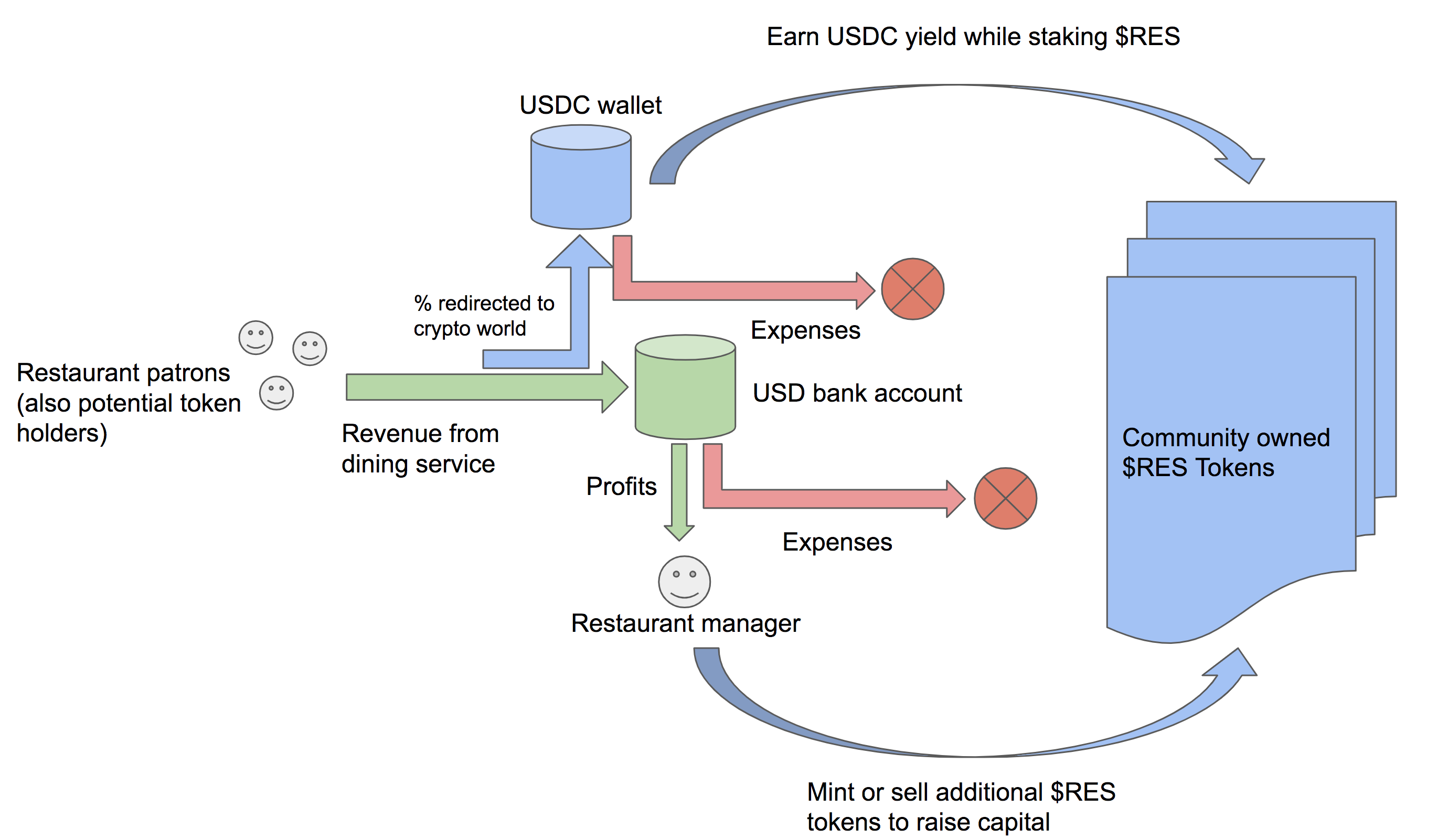 The manager pays for his renovation which works like a charm. The increase in patronage flows down to him in profits and grows the $RES token value since the USDC wallet is now taking in more funds. The process repeats and now lots of improvement ideas are starting to come in from $RES token owners, many of whom visit the restaurant frequently. The business begins to use DAO governance voting to decide which city to expand to next.